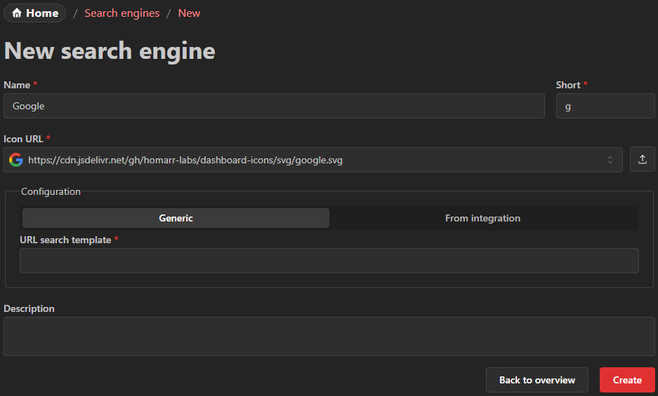 The template must be a valid URL that incldues the %s placeholder. Homarr will replace the %s with the term that the user entered.